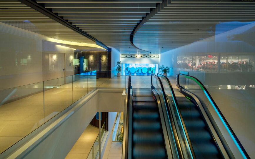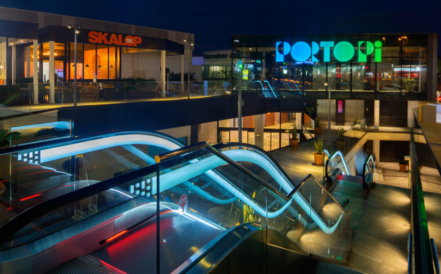 El Centro Comercial Porto Pi está situado en el paseo marítimo de Palma de Mallorca. En lo últimos años se ha llevado a cabo un proyecto de renovación de EOS Arquitectura y Edificación con una inversión de 26 millones de euros. AOM ha realizado la iluminación de todo el centro comercial. En el interior se ha ejecutado una iluminación cálida conectando los espacios comunes en los diferentes niveles. La iluminación del exterior del proyecto ha tenido mucha importancia debido a su conexión con la ciudad y al carácter marítimo del propio proyecto.